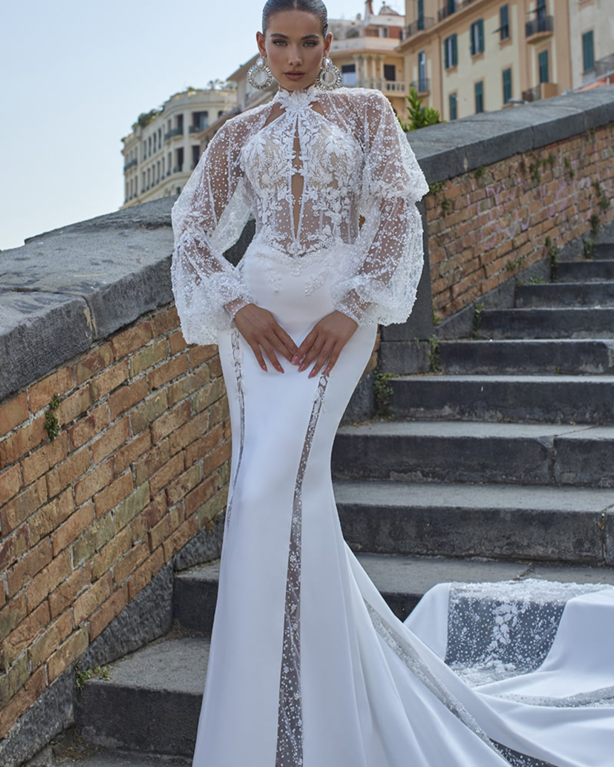 Le forme sinuose ed eleganti di Dalin esaltano la femminilità di una sposa raffinata e seducente. I tessuti pregiati e lavorati con sartoriale sapienza risplendono nell’aristocratica dimora d’epoca che ha ospitato la campagna immagine di questa collezione, frutto di un intenso lavoro di studio tra charme e perfezione.