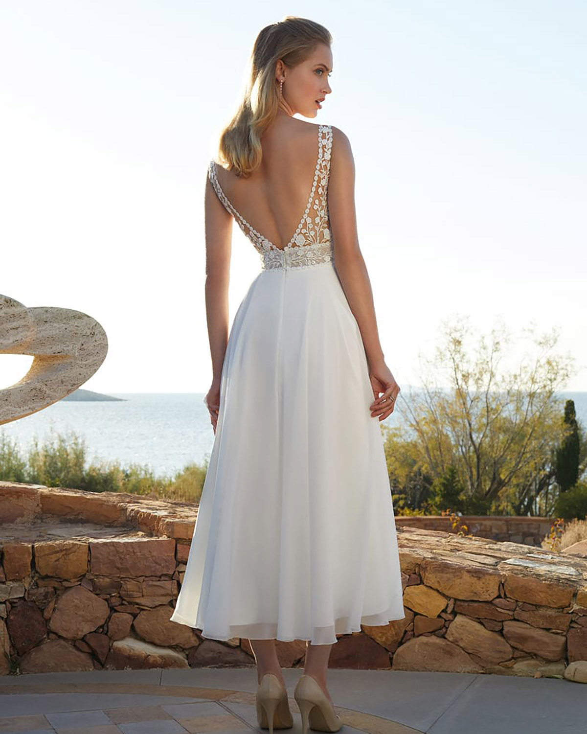 🤍 Dritto, in stile boho-chic e realizzato in mussolina con dettagli in strass, l’abito presenta uno scollo a V e lascia scoperta la schiena. Le spalline gioiello e la gonna con spacco frontale lo rendono raffinato e seducente.