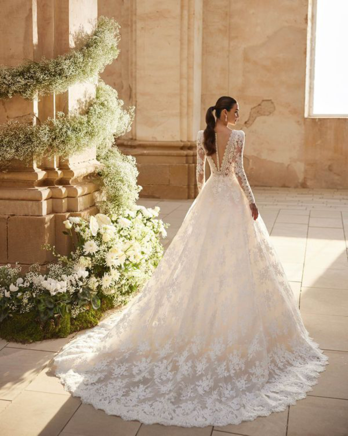 🤍 Realizzato in pizzo, strass e tulle royal, questo modello principessa a maniche lunghe presenta uno scollo rotondo e lascia la schiena scoperta.