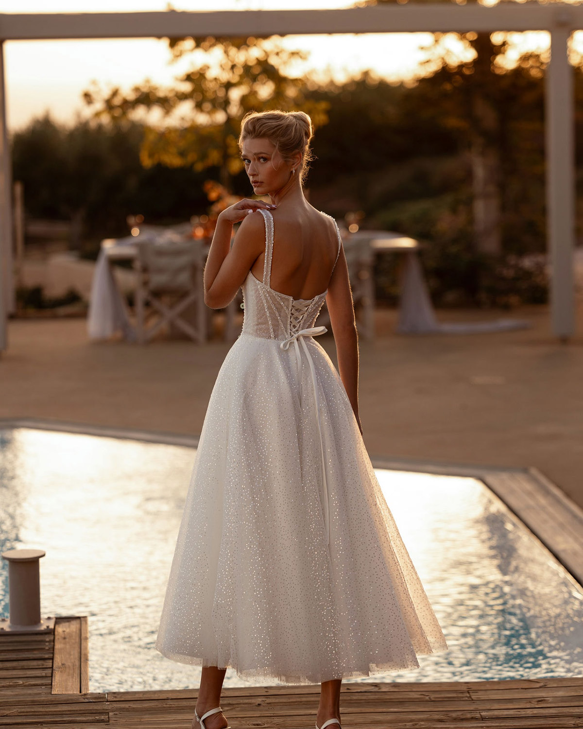 🤍 Dritto, in stile boho-chic e realizzato in mussolina con dettagli in strass, l’abito presenta uno scollo a V e lascia scoperta la schiena. Le spalline gioiello e la gonna con spacco frontale lo rendono raffinato e seducente.