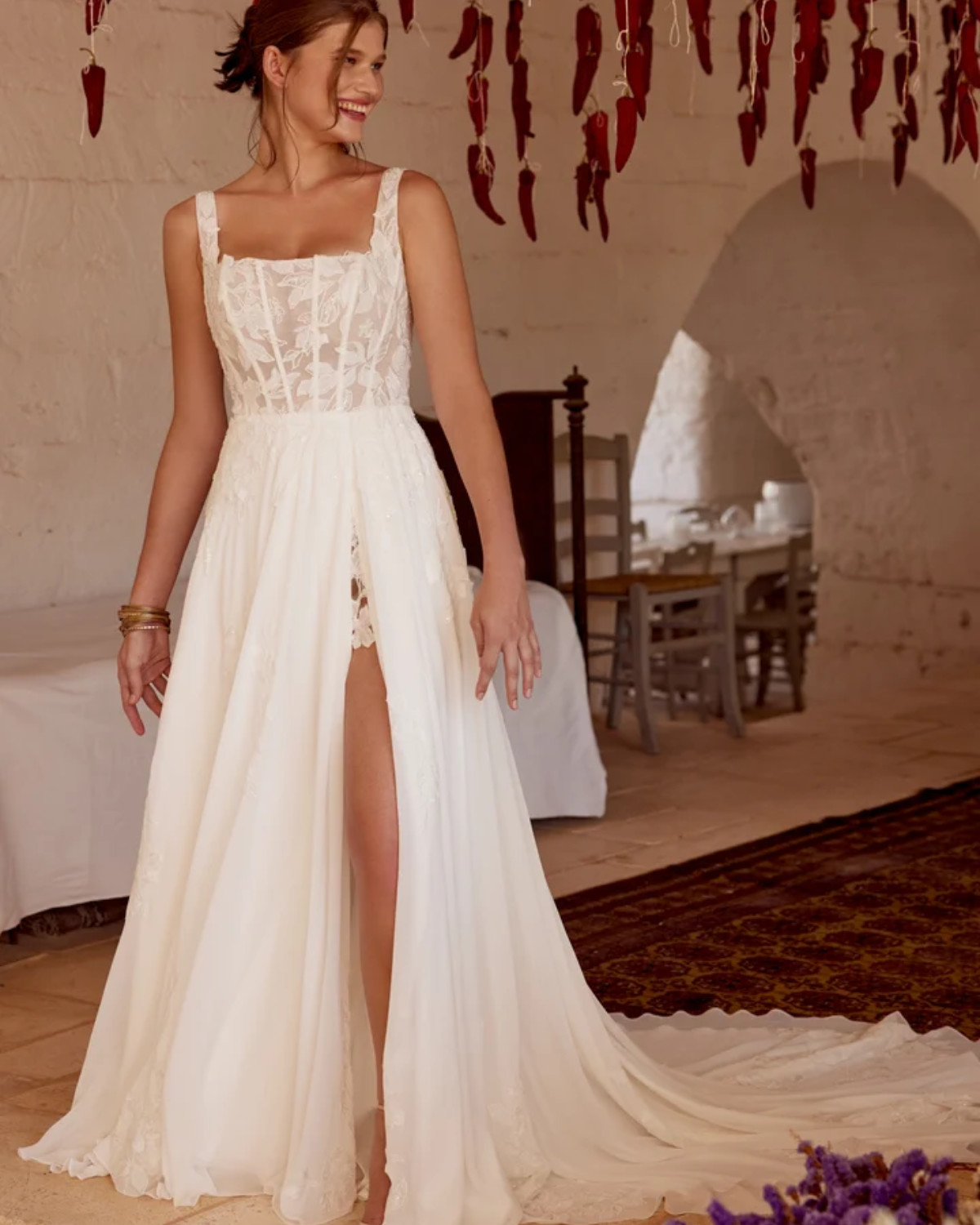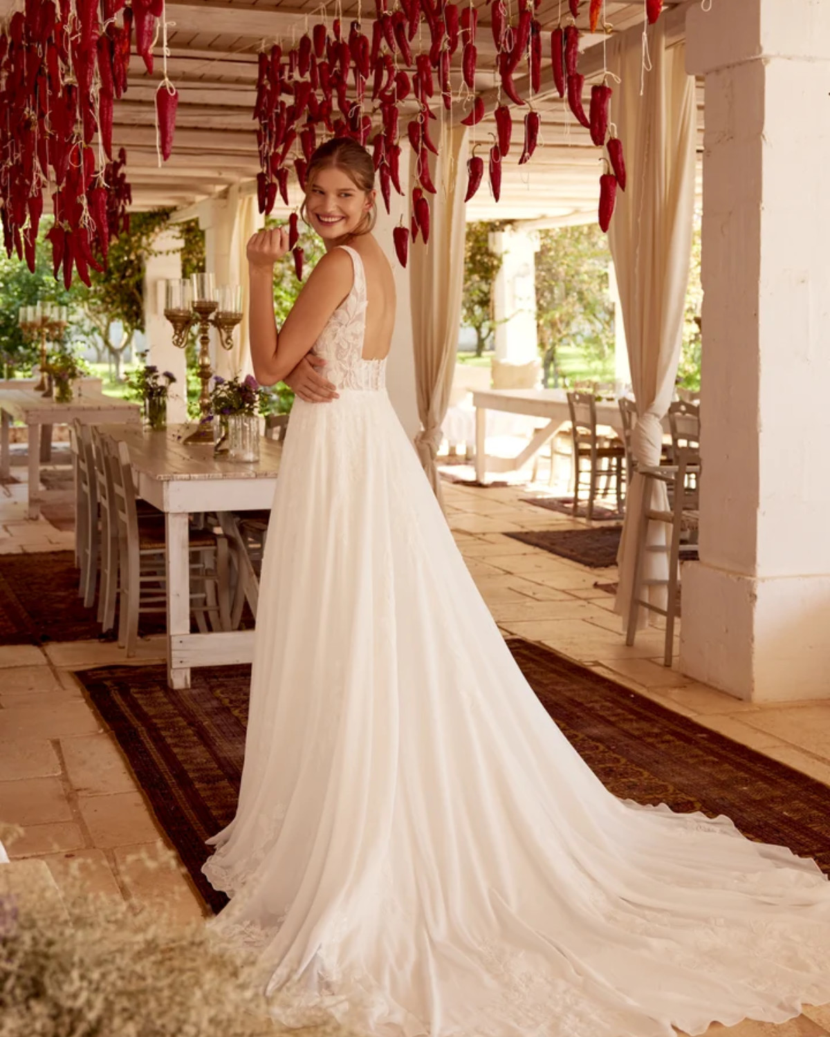 🌸 Abiti a sirena girocollo, con scollo all’americana, con scollo a V: tutti danno alle spose un look fresco e moderno, riflettendo il caratteristico romanticismo di Rosa Clará.