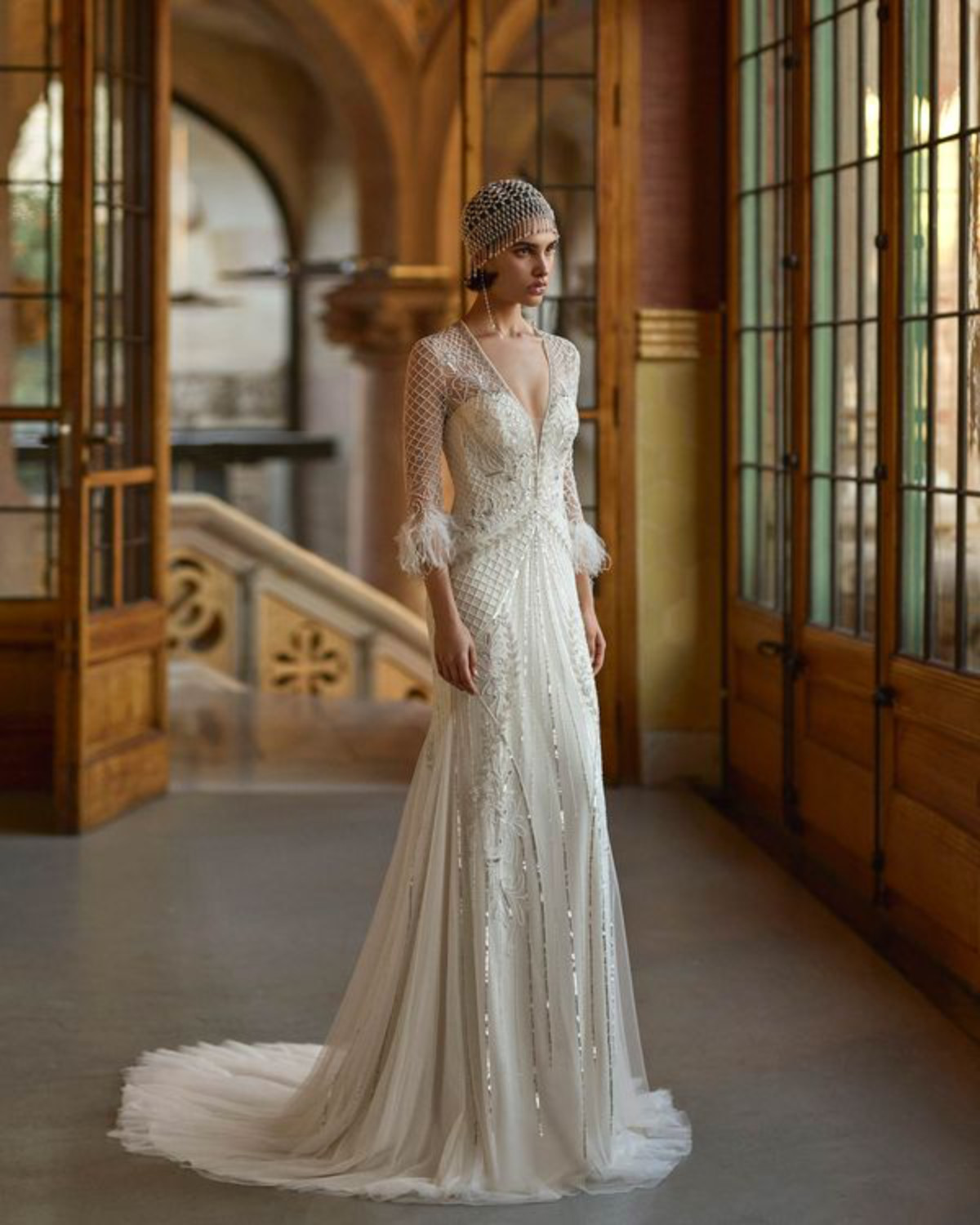 🤍 Realizzato in pizzo, strass e tulle royal, questo modello principessa a maniche lunghe presenta uno scollo rotondo e lascia la schiena scoperta.
