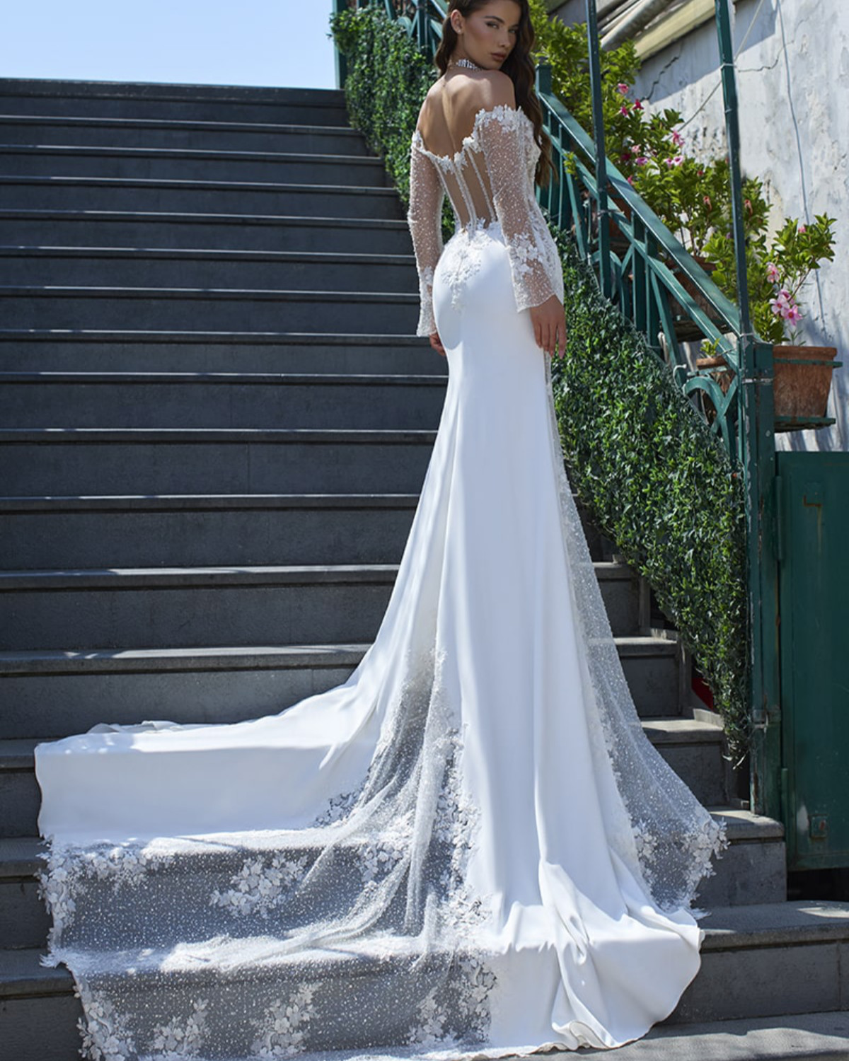 🤍 Realizzato in pizzo, strass e tulle royal, questo modello principessa a maniche lunghe presenta uno scollo rotondo e lascia la schiena scoperta.