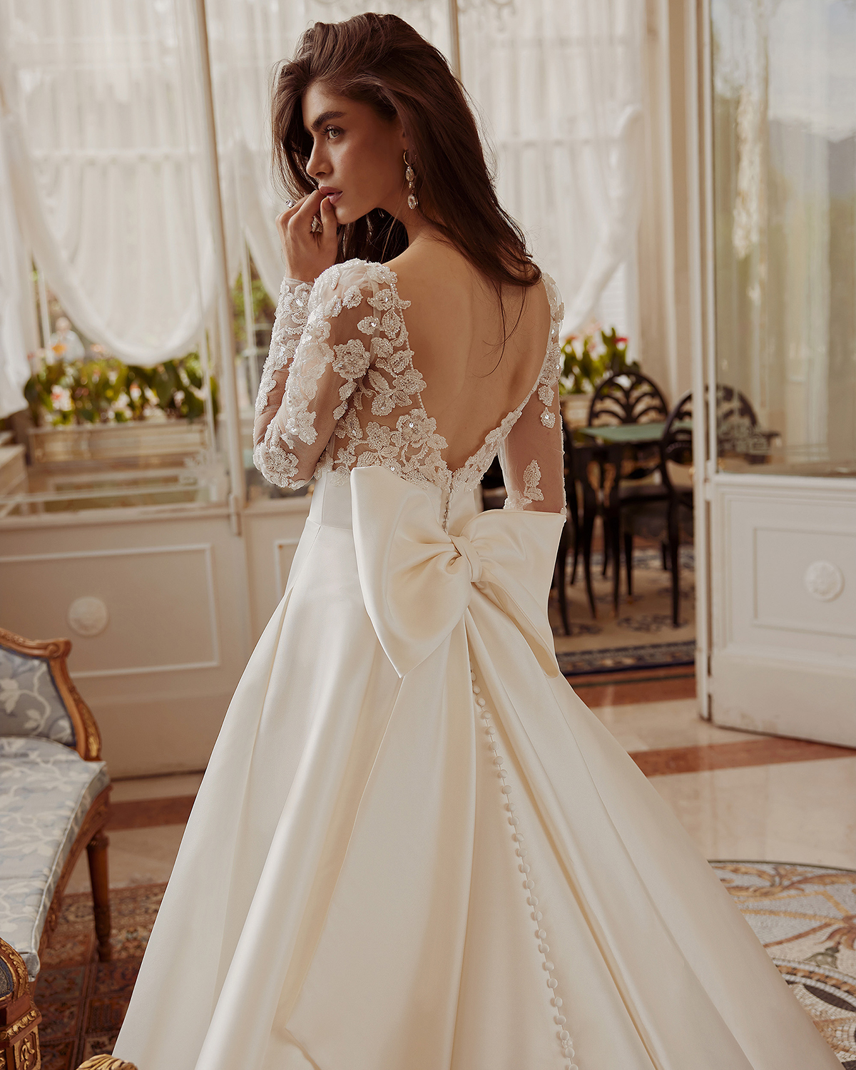🤍 Realizzato in pizzo, strass e tulle royal, questo modello principessa a maniche lunghe presenta uno scollo rotondo e lascia la schiena scoperta.