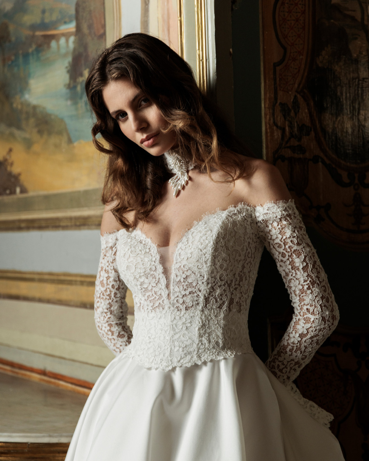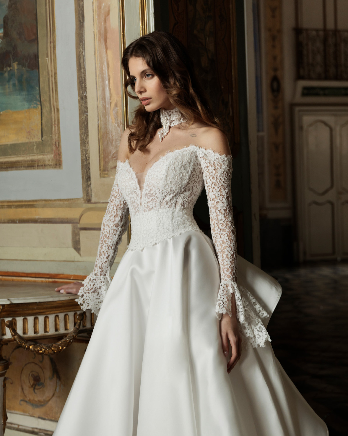 🤍 Realizzato in pizzo, strass e tulle royal, questo modello principessa a maniche lunghe presenta uno scollo rotondo e lascia la schiena scoperta.