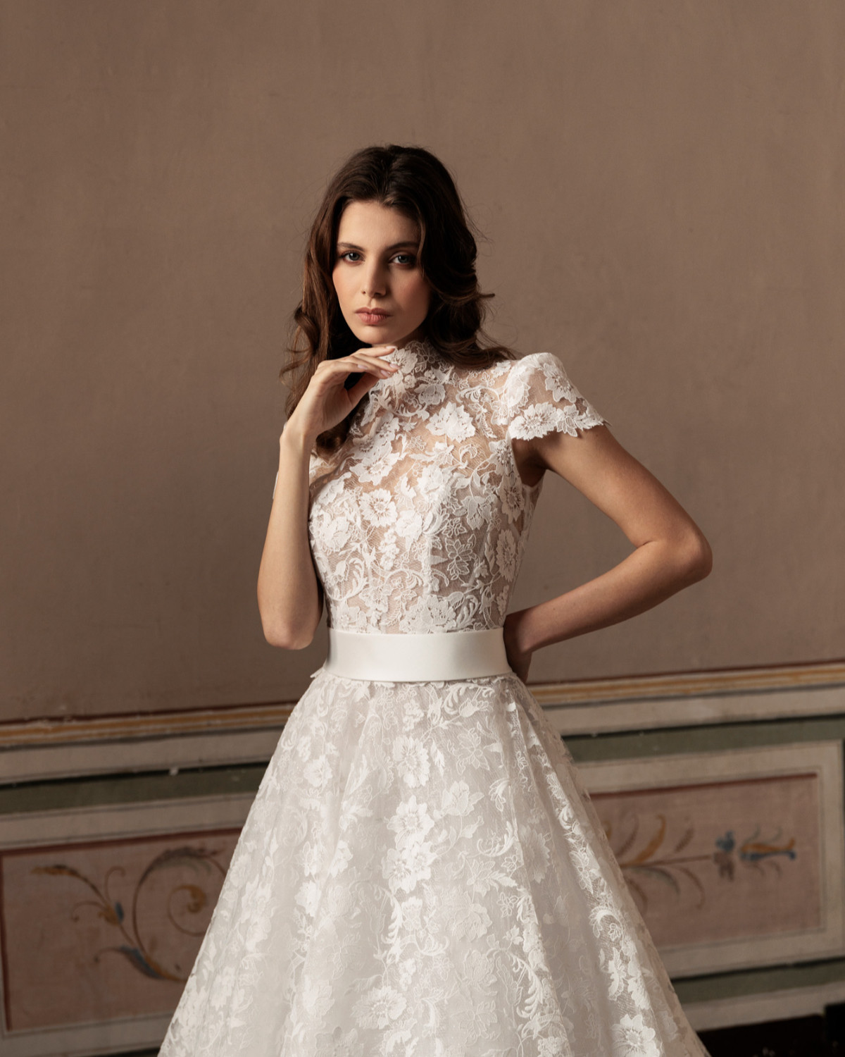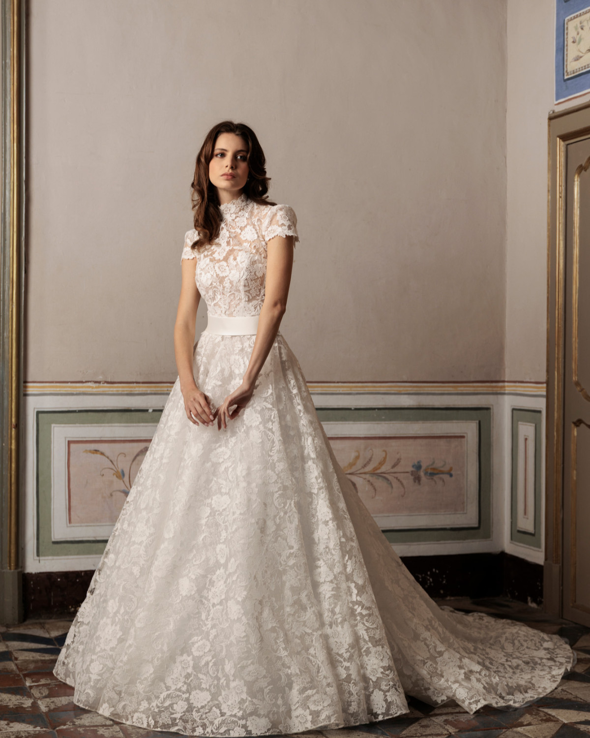 🤍 Realizzato in pizzo, strass e tulle royal, questo modello principessa a maniche lunghe presenta uno scollo rotondo e lascia la schiena scoperta.