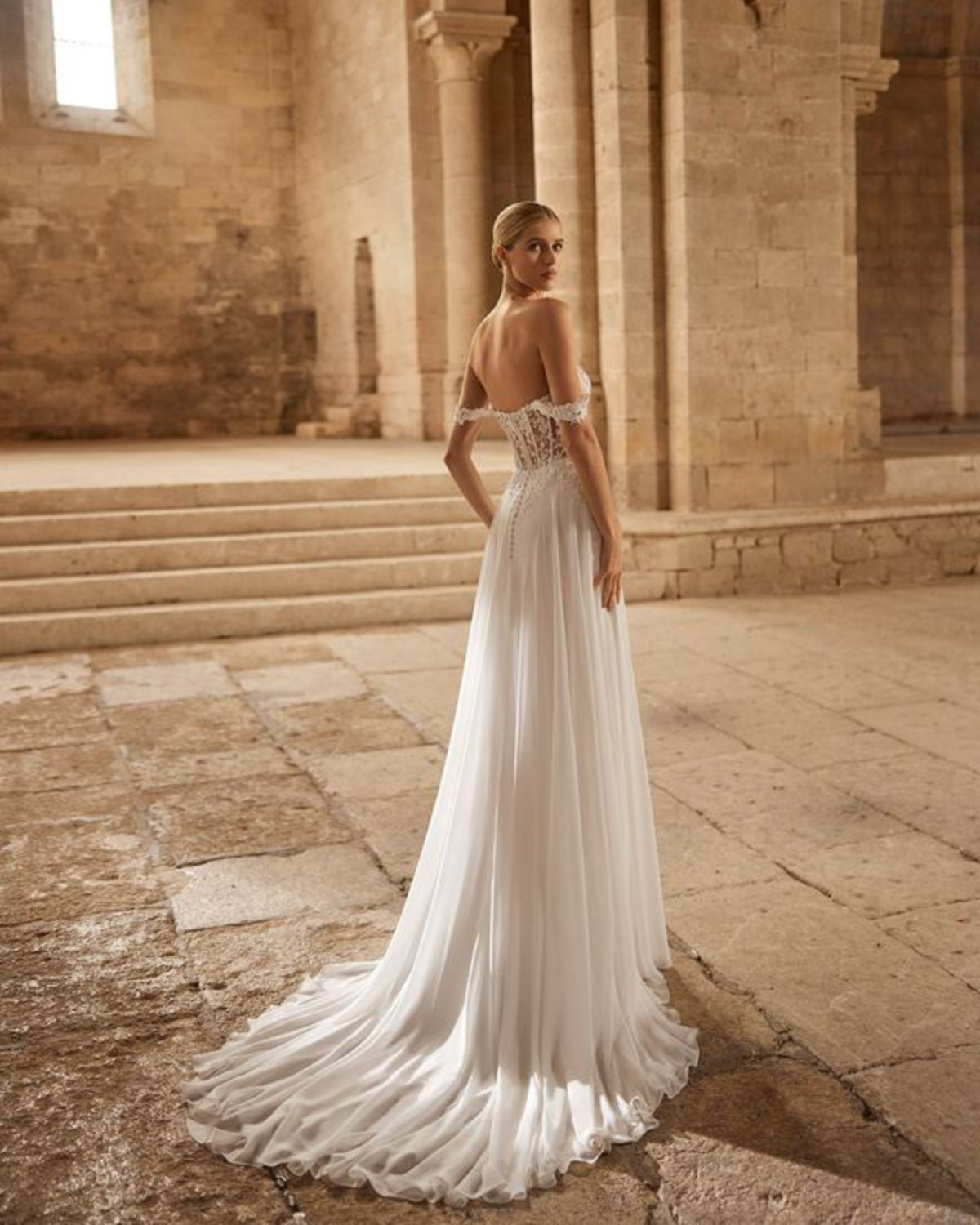 🌸 Abiti a sirena girocollo, con scollo all’americana, con scollo a V: tutti danno alle spose un look fresco e moderno, riflettendo il caratteristico romanticismo di Rosa Clará.