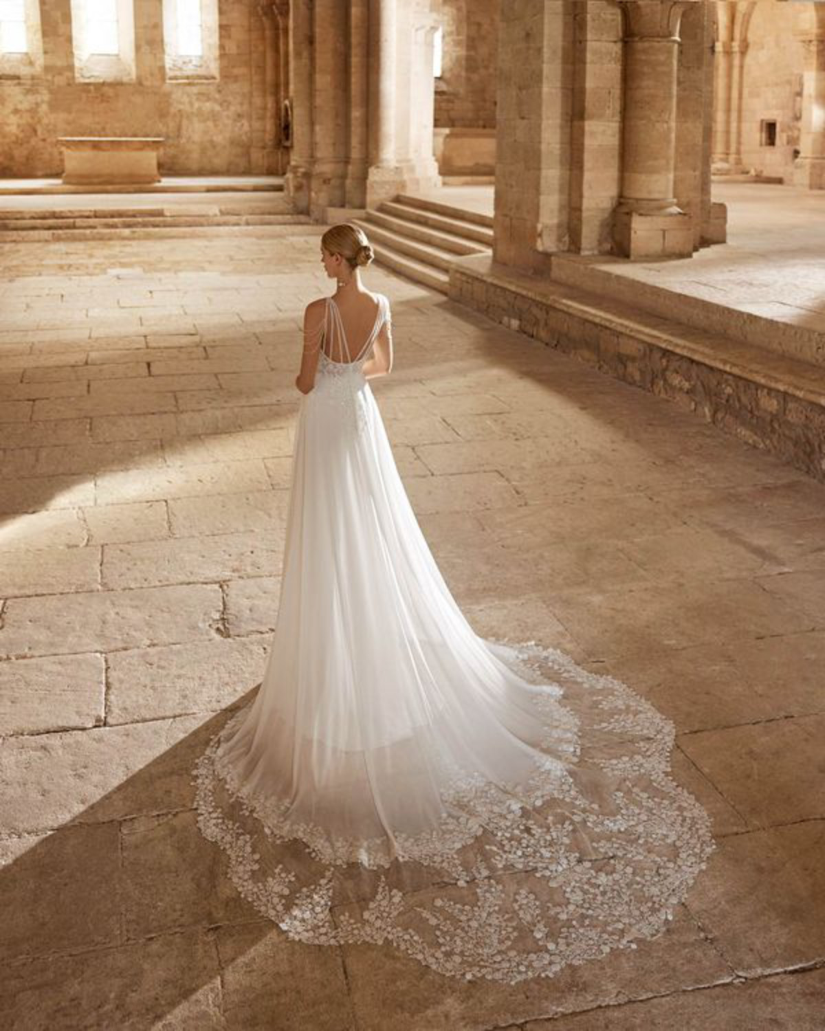 🌸 Abiti a sirena girocollo, con scollo all’americana, con scollo a V: tutti danno alle spose un look fresco e moderno, riflettendo il caratteristico romanticismo di Rosa Clará.