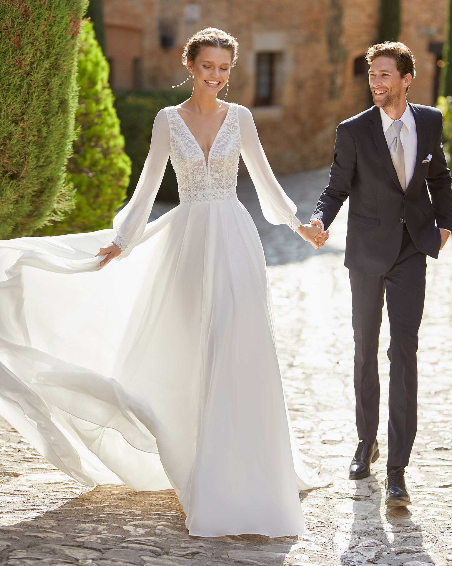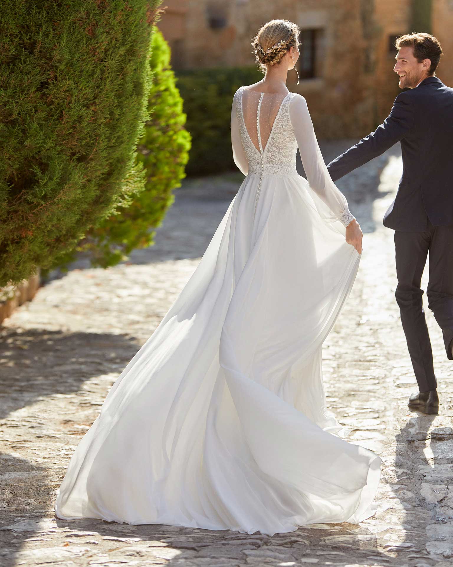 Abito da sposa in stile ballgown boho-chic con corpetto in pizzo decorato con perline; con scollo a V, schiena chiusa con tulle a pois e bottoni in madreperla, e maniche lunghe in georgette con bordo in pizzo sui polsini