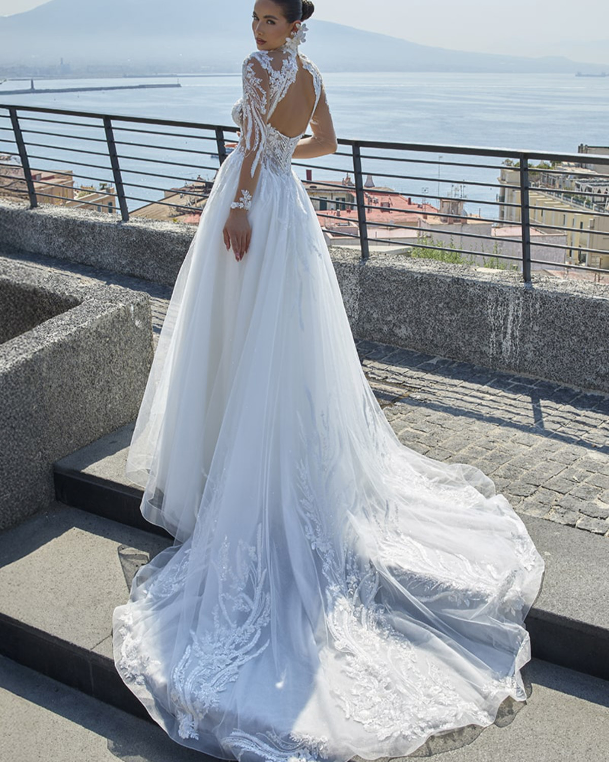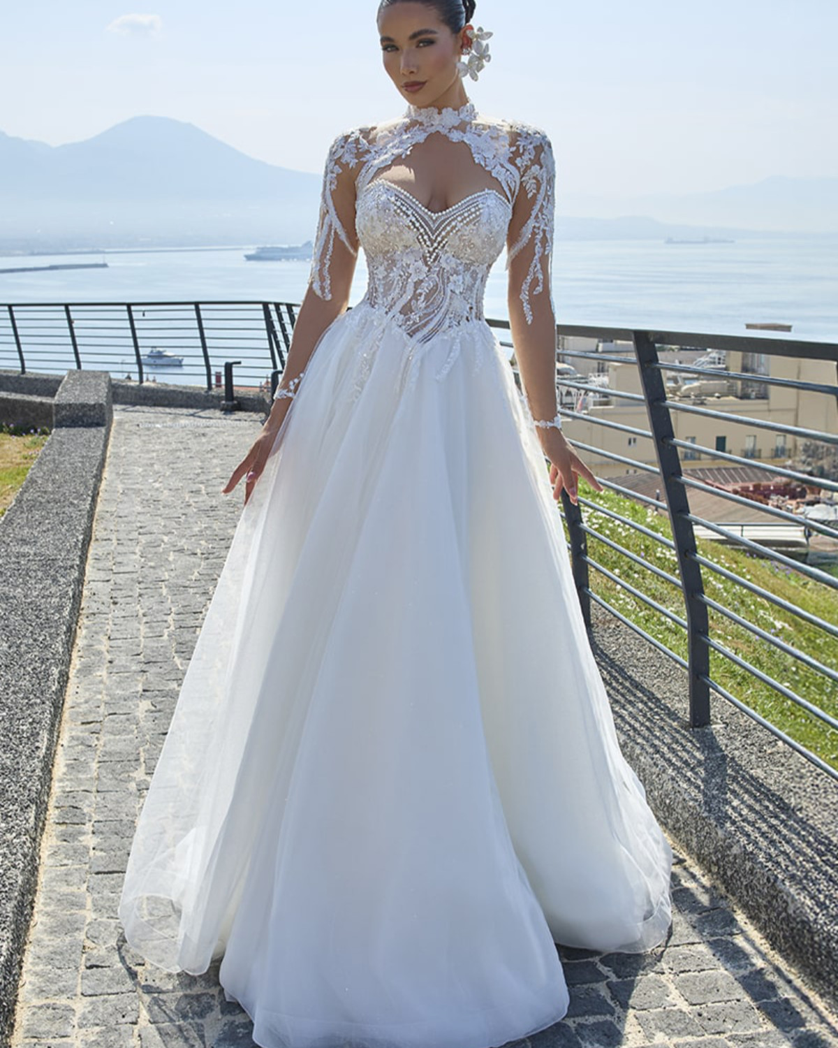 🤍 Realizzato in pizzo, strass e tulle royal, questo modello principessa a maniche lunghe presenta uno scollo rotondo e lascia la schiena scoperta.