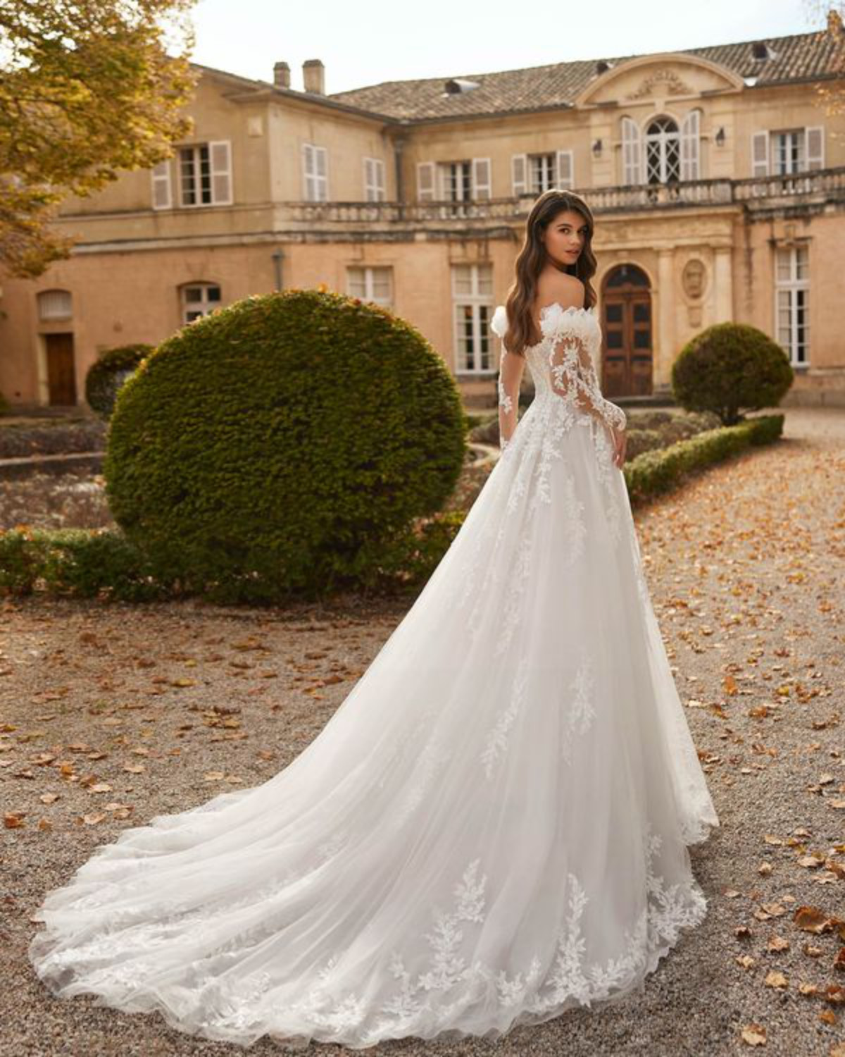 🤍 Realizzato in pizzo, strass e tulle royal, questo modello principessa a maniche lunghe presenta uno scollo rotondo e lascia la schiena scoperta.