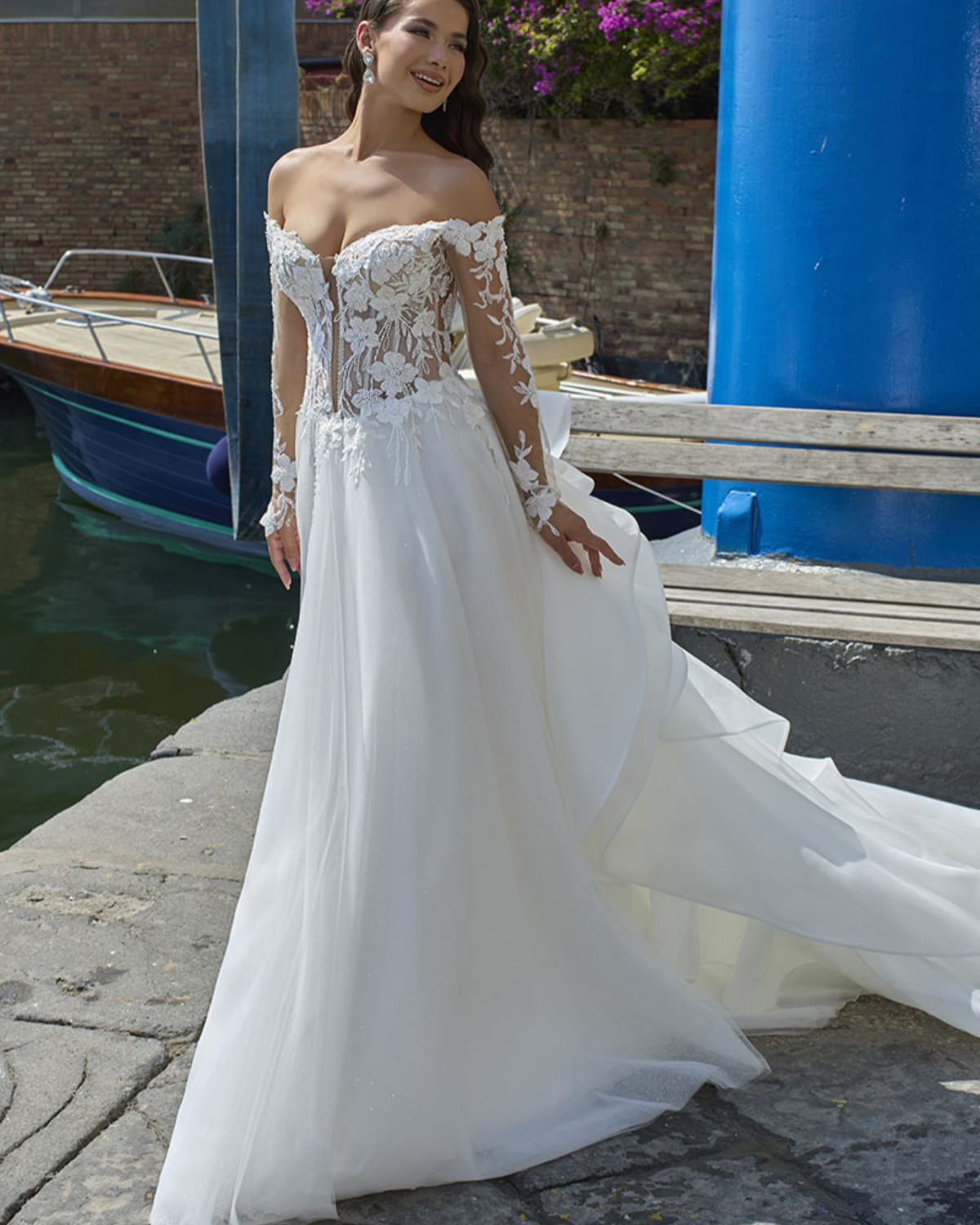 🤍 Realizzato in pizzo, strass e tulle royal, questo modello principessa a maniche lunghe presenta uno scollo rotondo e lascia la schiena scoperta.