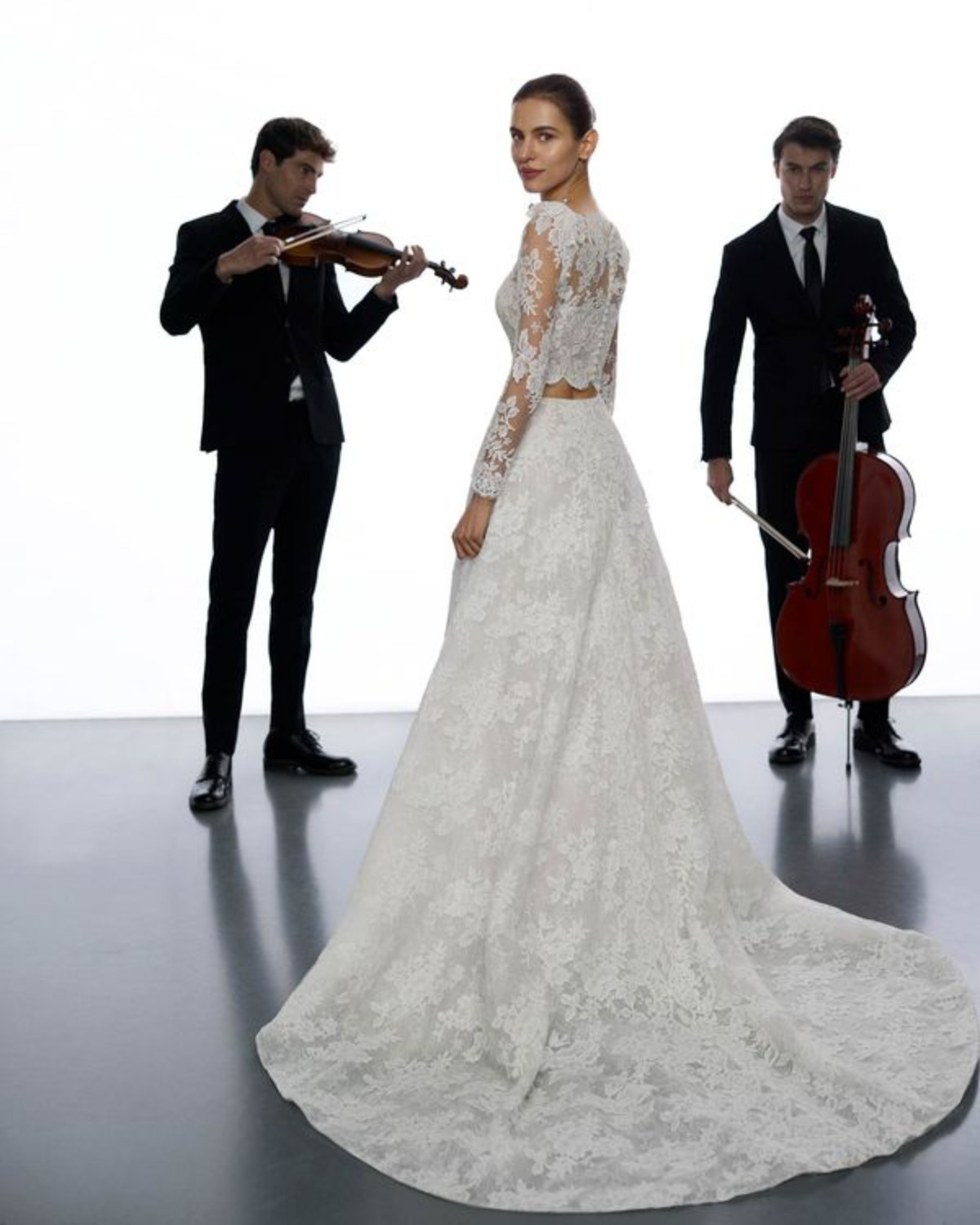 🤍 Realizzato in pizzo, strass e tulle royal, questo modello principessa a maniche lunghe presenta uno scollo rotondo e lascia la schiena scoperta.